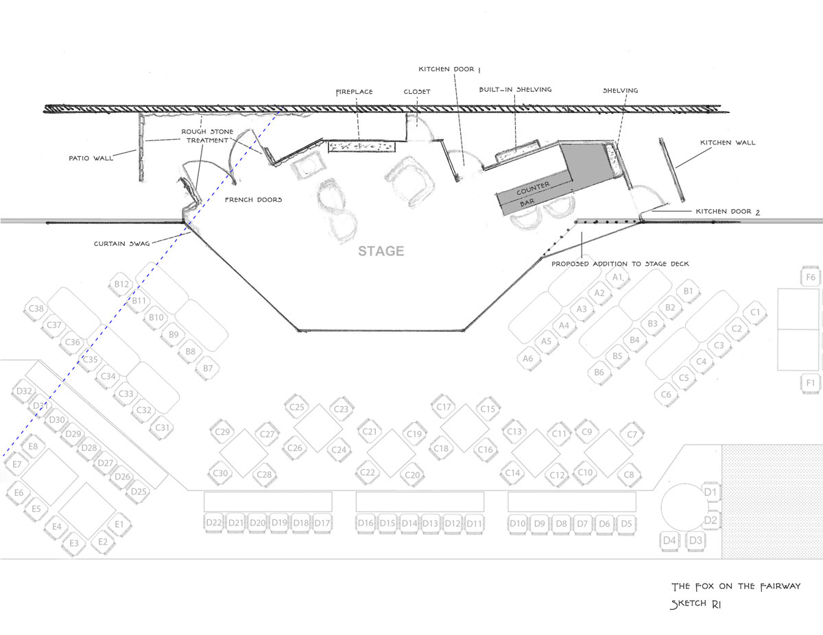 I found that small adjustments to the space went a long way. I needed to create not only several off-stage locations, but discrete locales within the unit set as well. Jutting architecture, like a wall corner or a bar, into the space just enough to break up the room, but not too much to hinder the constant running, actually helped the precarious whirlwind movement of the farce.
