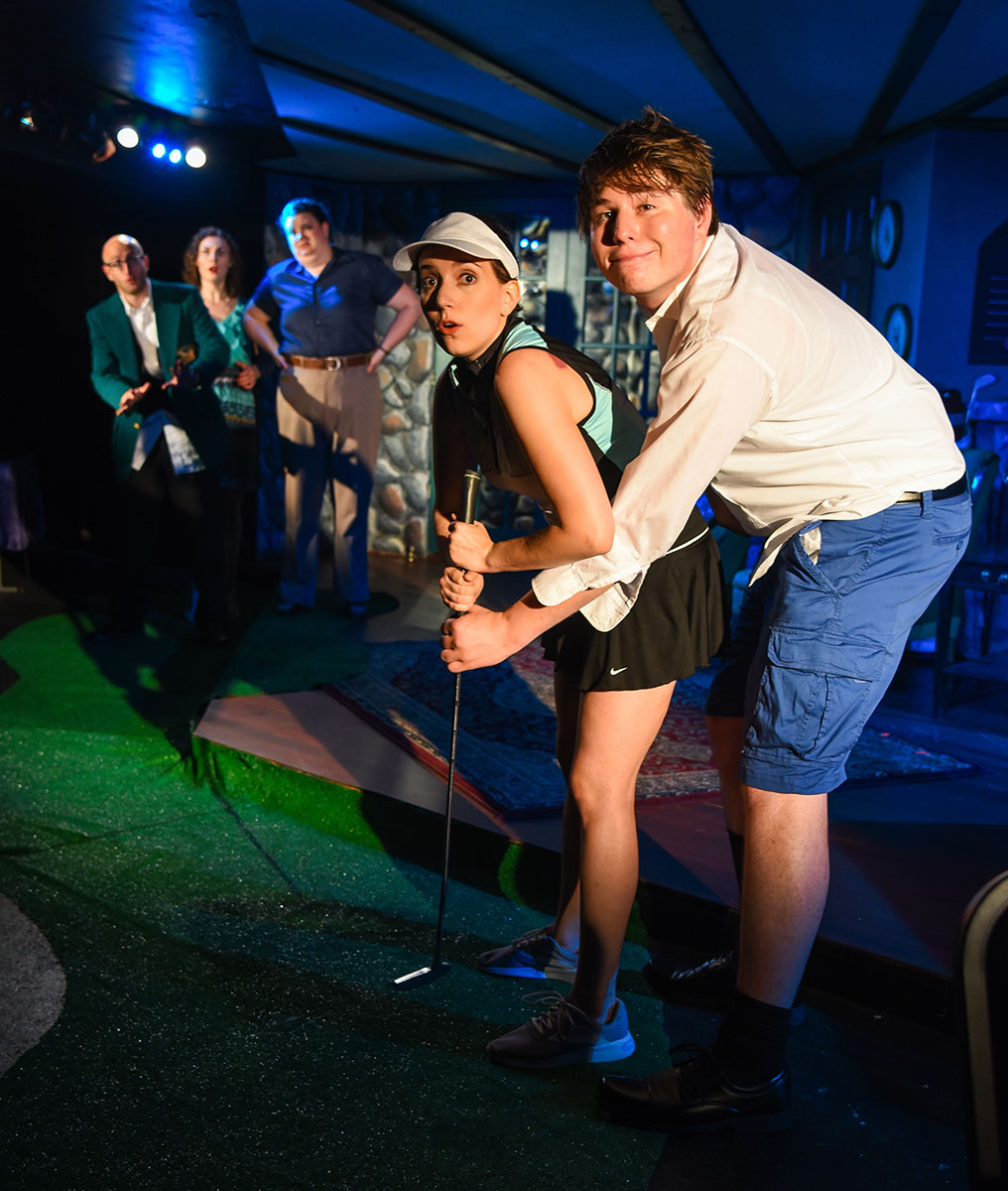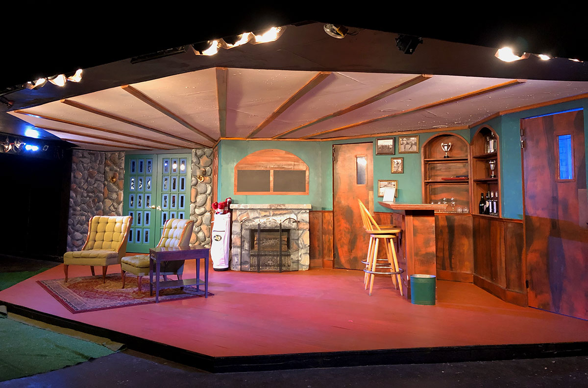 Often a play, and a director, call for realism, to which I oblige. There was still much I could influence, and I wanted to set up the right pretense for this farce. While the play takes place in what could be described as not the richest of club houses, there was something louche about the characters it represented, even in a dated, desperate way. I alluded to the dynamism in bold, specific strokes. While staying away from an abundance of competing naturalistic textures or opulence, I kept the design simple and wanting. I instead focused on the main elements of wood, stone, and my “brand” color, amping their vibrancy and dimension, matching the energy of the characters.